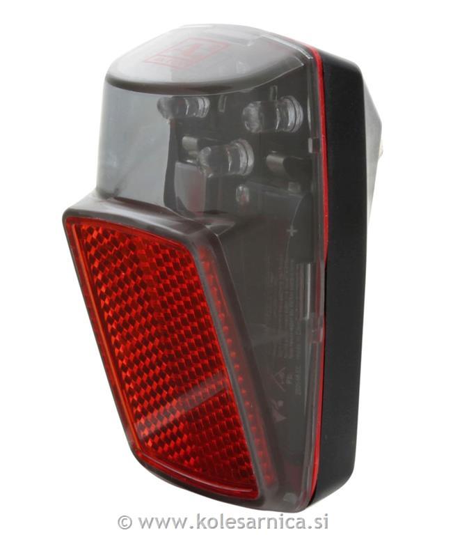 Zadnja baterijska luč s 3 LED diodami in odsevnikom, pritrditev na zadnji blatnik. Deluje na AAA baterije.