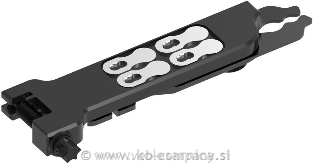 Lezyne Multi Chain Plier, majhno multifunkcijsko orodje, ki se pospravi v torbico ali žep kolesarskega dresa. Orodje za hitre spojke verige, snemalec verige, orodje za odstranitev ventila, odpirač za steklenice, orodje za poravnavo disk rotorja in magnetna držala za dve rezervni hitri spojki verige.