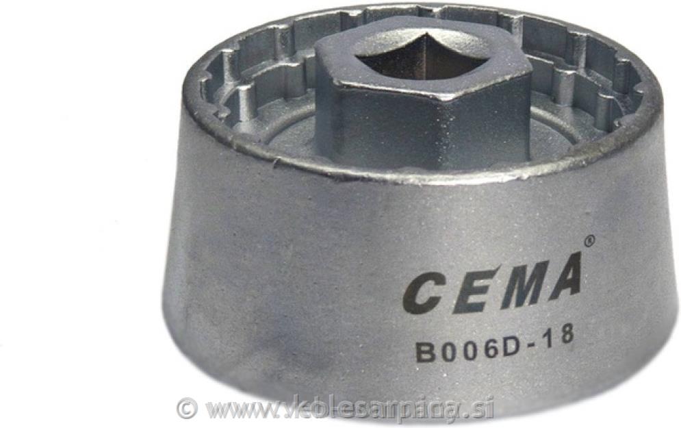 CEMA SRC-TT-B006D-18 je specializirano dvostransko orodje za montažo in demontažo srednjih ležajev (bottom bracket) na kolesih, zasnovano za profesionalno in domačo uporabo pri vzdrževanju koles. Orodje se odvijanje/privijanje ležaja nasadi na nasadni ključ 3/8'' ali na viličasti ključ 20/21mm.